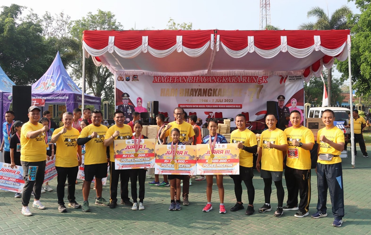 TEROPONGNUSA.COM | MAGETAN – Lomba Fun Run 5K menyambut HUT Bhayangkaa ke-77 menjadi upaya Polres Magetan menjalin keakraban dengan masyarakat. Hal itu disampaikan Kapolres Magetan, AKBP Muhammad Ridwan usai mengikuti lomba, Minggu (25/6/2023).