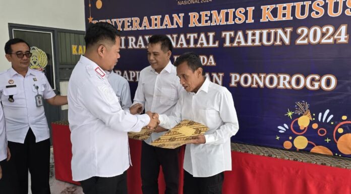 PONOROGO, TEROPONGNUSA.COM – Seusai mengikuti Zoom Meeting bersama Menteri Imigrasi dan Pemasyarakatan, Kepala Rutan Kelas IIB Ponorogo, Agus Imam Taufik, mengadakan kegiatan penyerahan remisi khusus keagamaan Hari Raya Natal kepada tiga warga binaan.