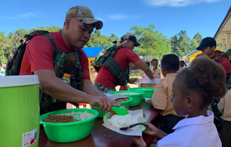Salah satu siswa, Yulius (9), mengatakan, “Terima kasih, Pak Tentara! Makanannya enak sekali, saya senang bisa makan siang dengan teman-teman!”