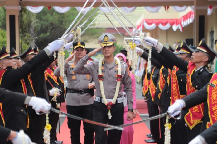Momen haru mengiringi pelepasan AKBP Satria Permana melalui gerbang pedang pora. Ia kini dipromosikan sebagai Kasi Bin Yan Subdit BPKB Dit Regident Korlantas Mabes Polri.(DNY)