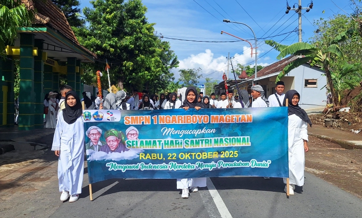 MAGETAN, TEROPONGNUSA.COM – SMPN 1 Ngariboyo menyelenggarakan Pawai Ta’aruf dalam rangka memperingati Hari Santri Nasional 2025. Kegiatan ini diikuti oleh seluruh pelajar sekolah dan diawali dengan doa serta dzikir bersama di masjid sekolah pada Rabu (22/10/2025).