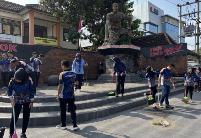 PONOROGO, TEROPONGNUSA.COM – Rumah Tahanan Negara (Rutan) Kelas IIB Ponorogo menggelar kerja bakti membersihkan fasilitas umum dalam rangka memperingati Hari Bakti Pemasyarakatan (HBP) ke-62, Selasa (7/4). Kegiatan difokuskan di area Patung Warok, Jalan HOS Cokroaminoto, Ponorogo.